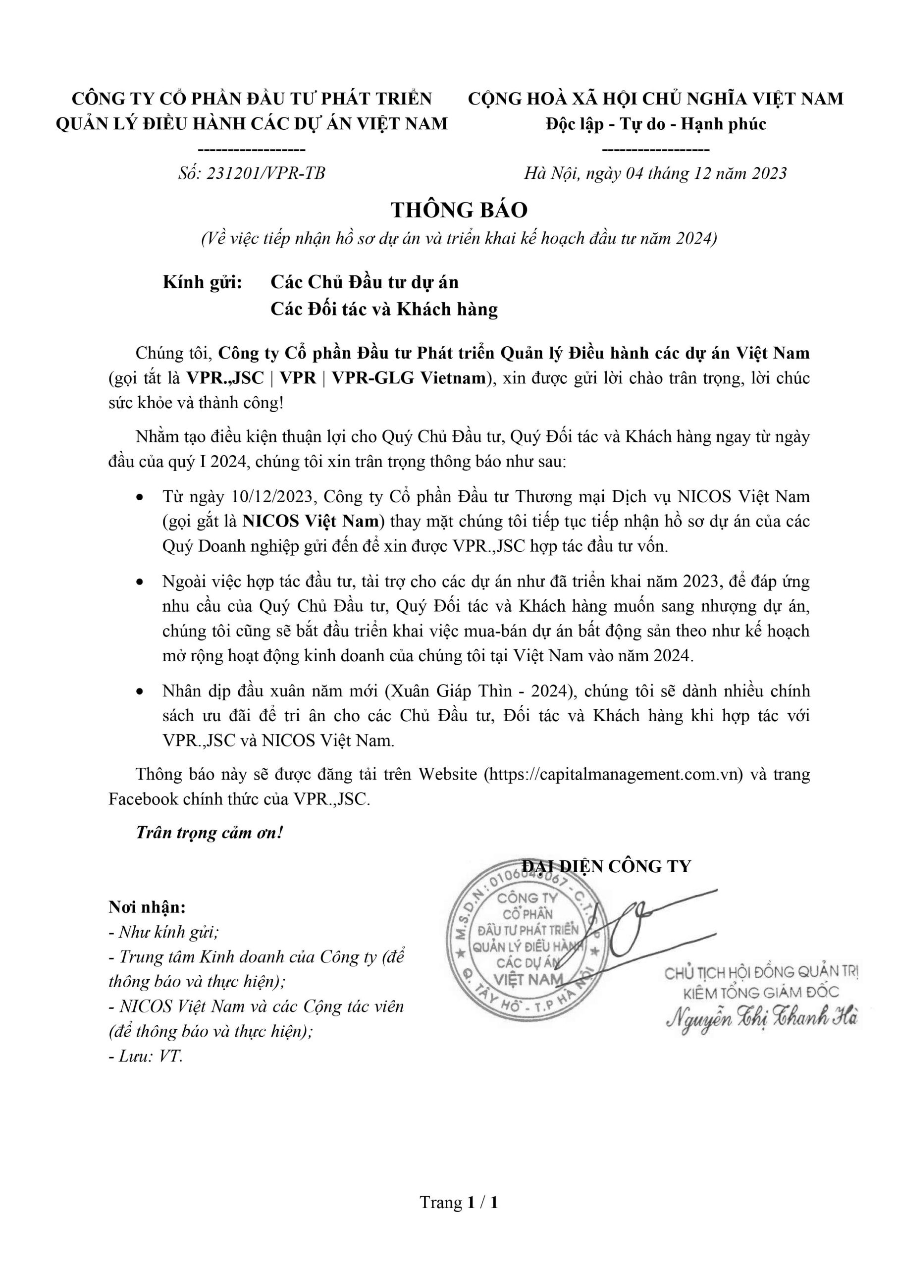 THÔNG BÁO VỀ VIỆC TIẾP NHẬN HỒ SƠ DỰ ÁN VÀ TRIỂN KHAI KẾ HOẠCH ĐẦU TƯ NĂM 2024
